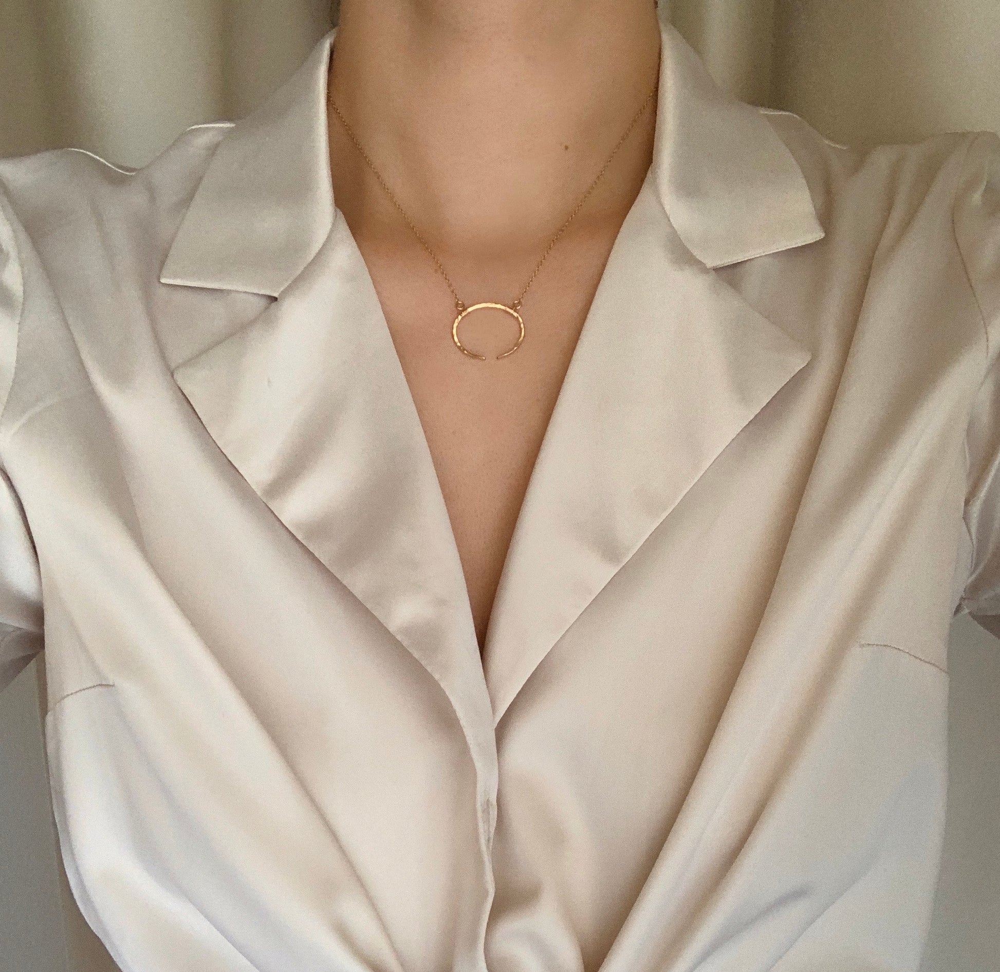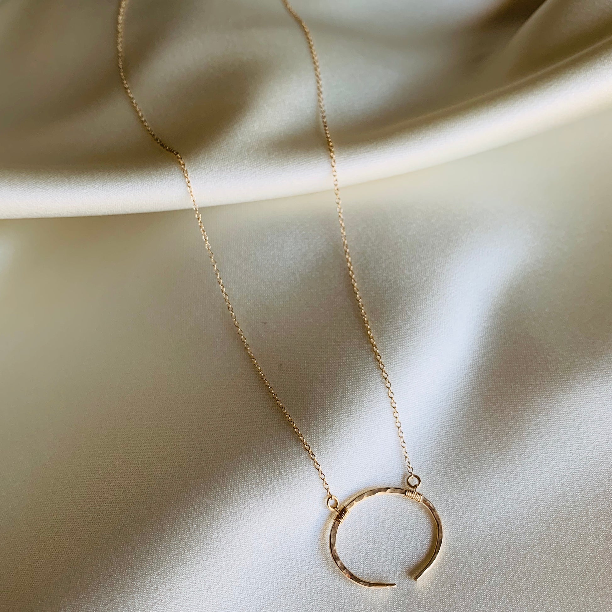 This necklace features a pendant that resembles a delicate embrace. With the same hammered detail that can be found throughout the Matriarch Collection, it reflects an understated sparkle and can be worn day & night. Hand formed pendant is approximately .5” long and .75” wide.