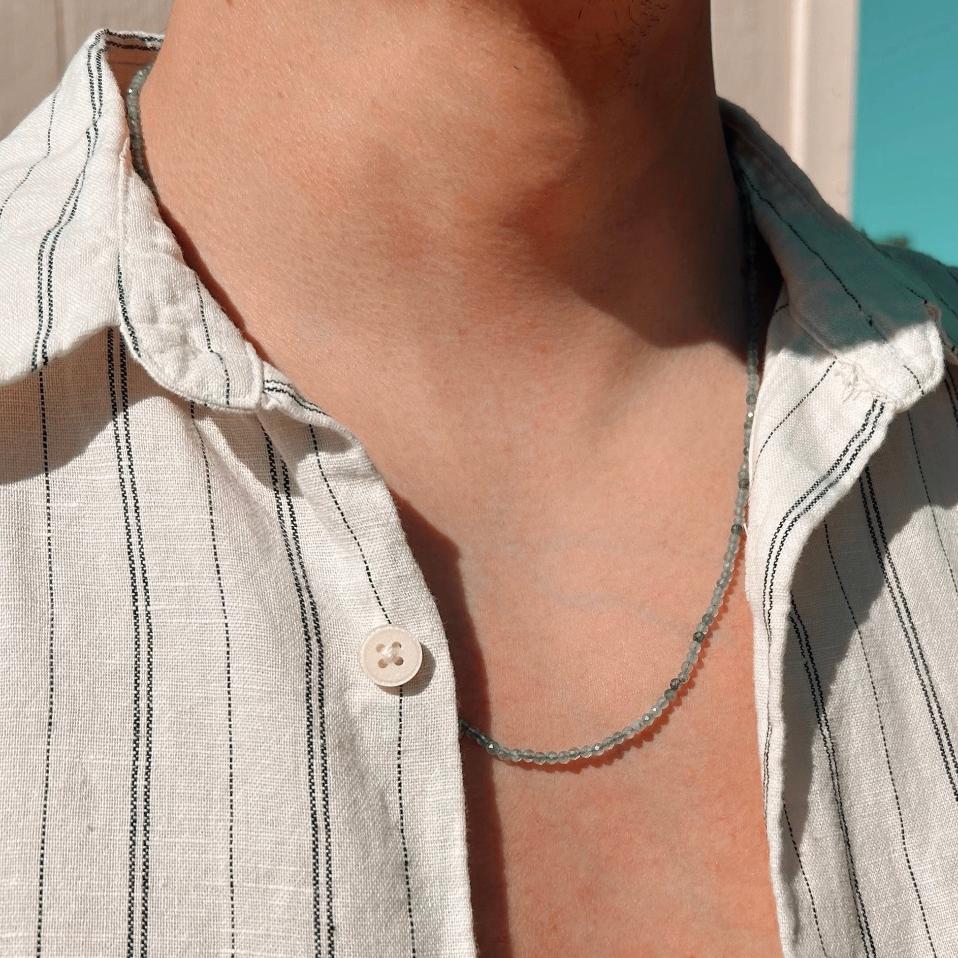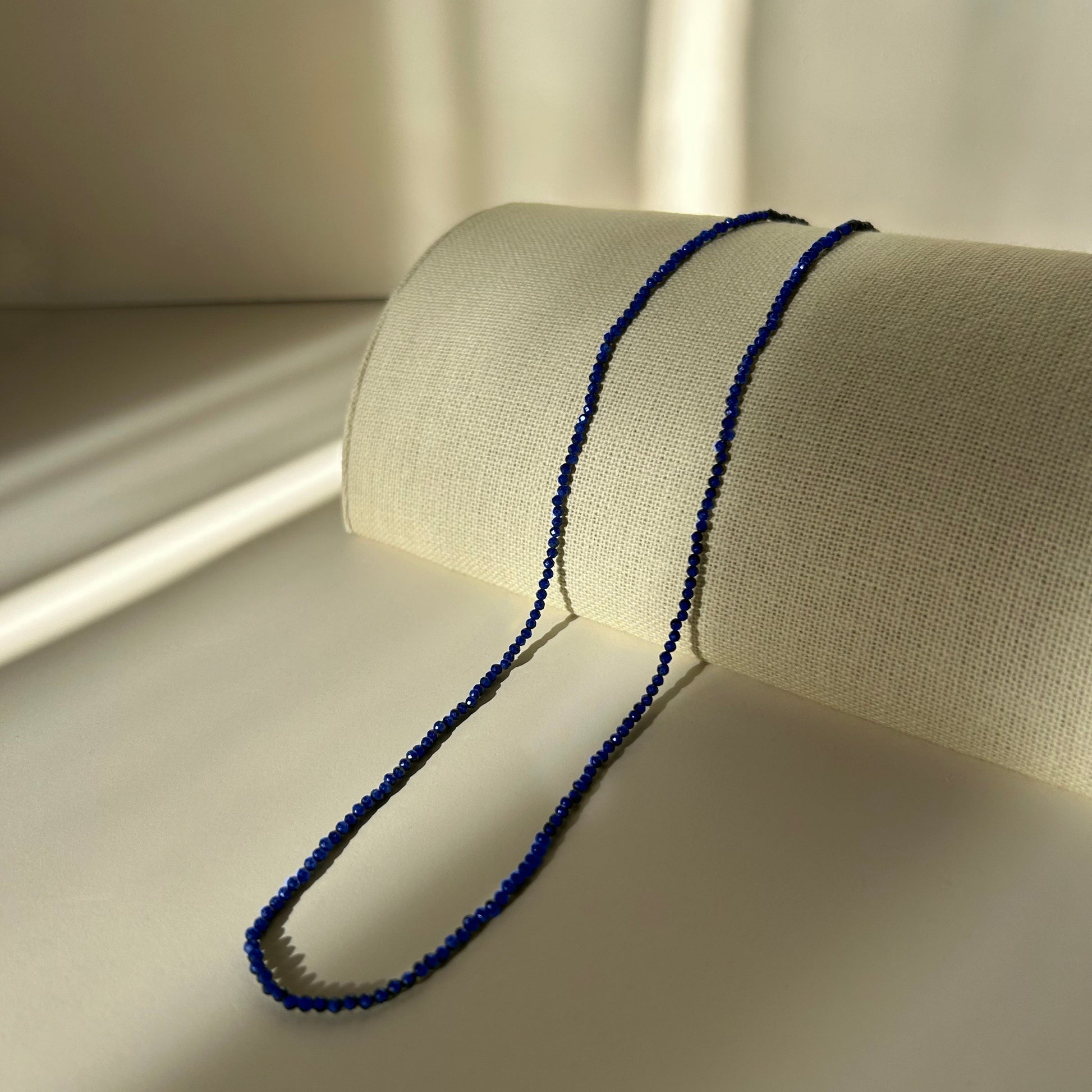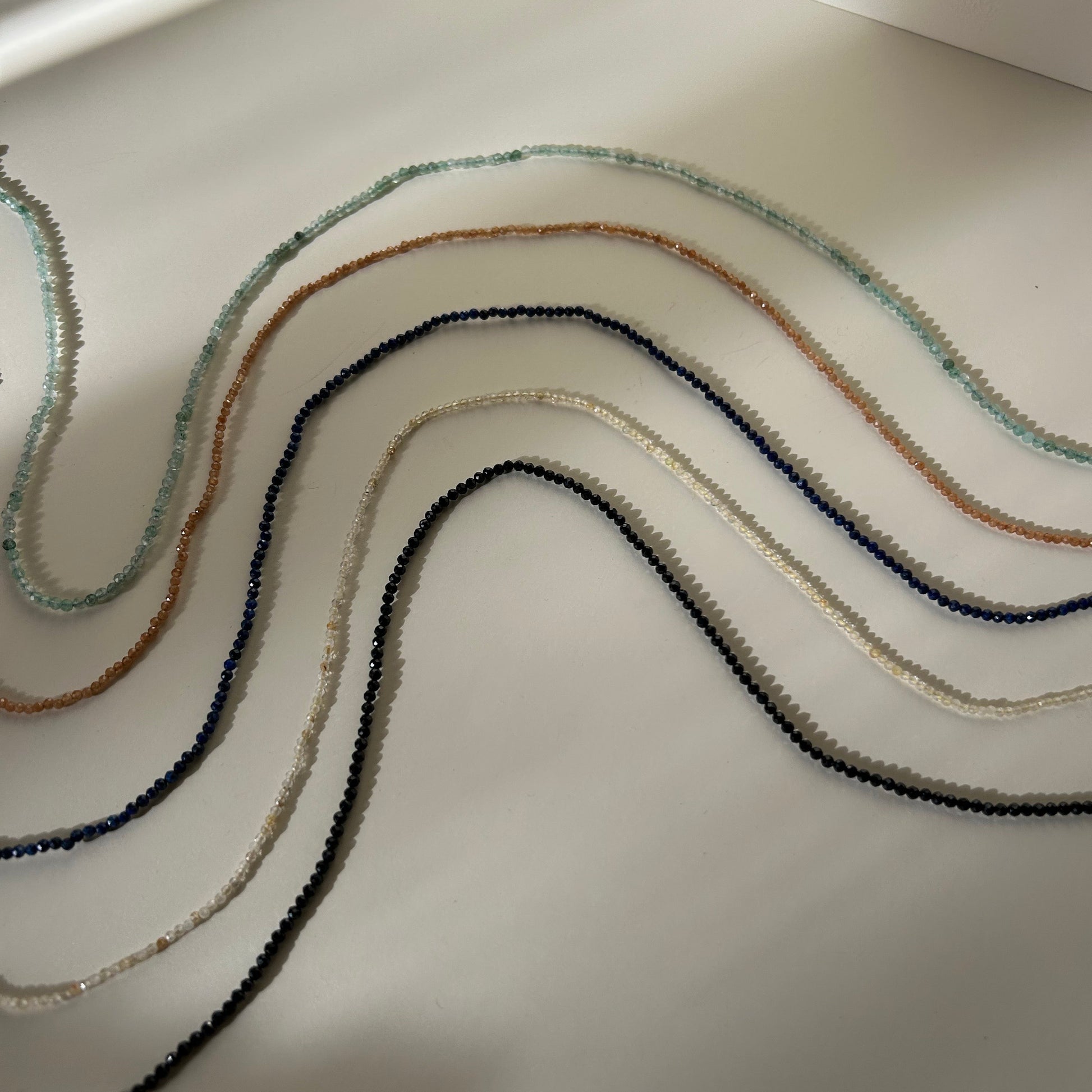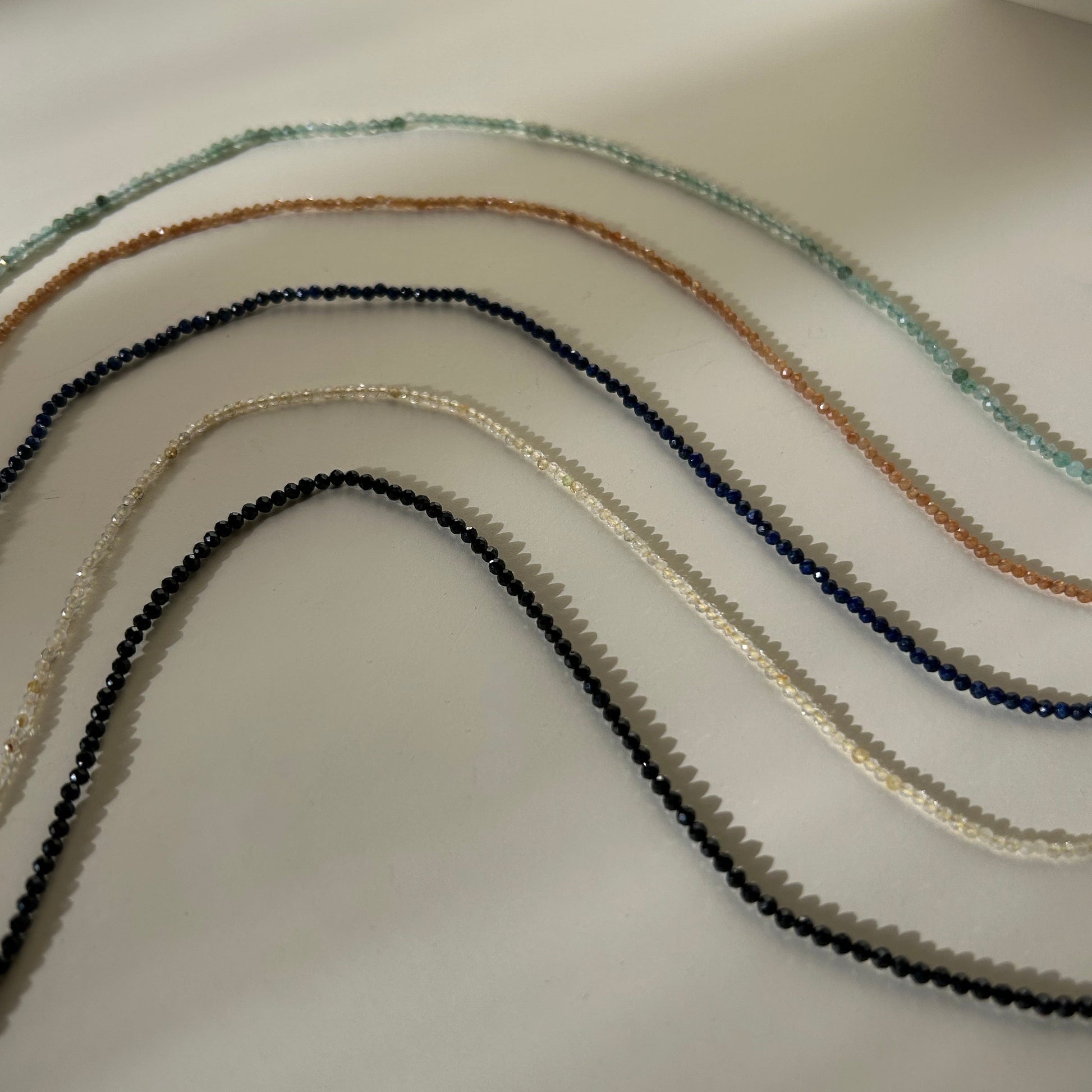 Faceted semiprecious beads strung on silk cord. Features 14k gold filled clasp.