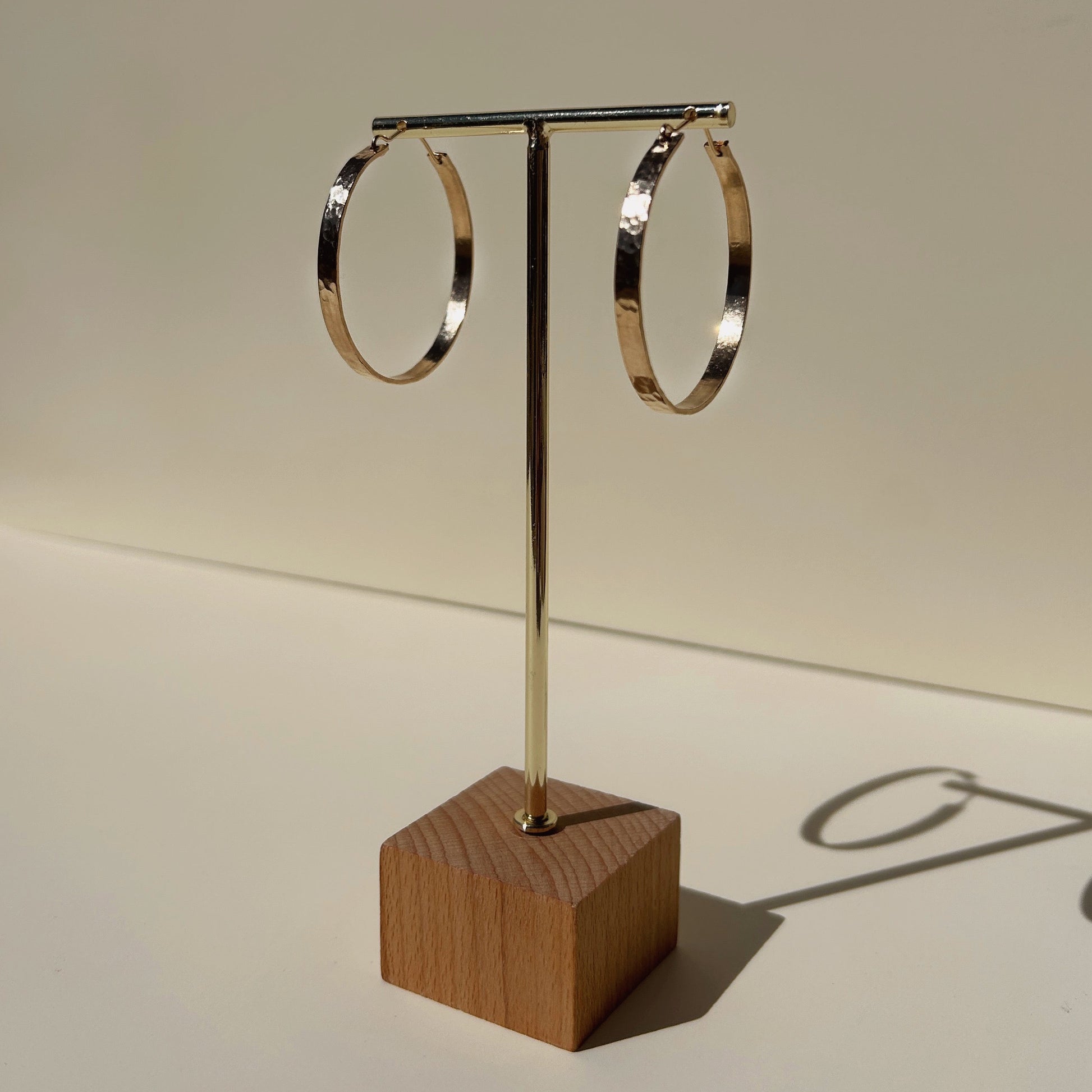 Glimmering hammered latch back hoop hangs approximately 2.5” from ear.