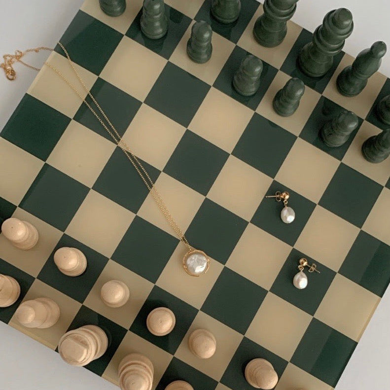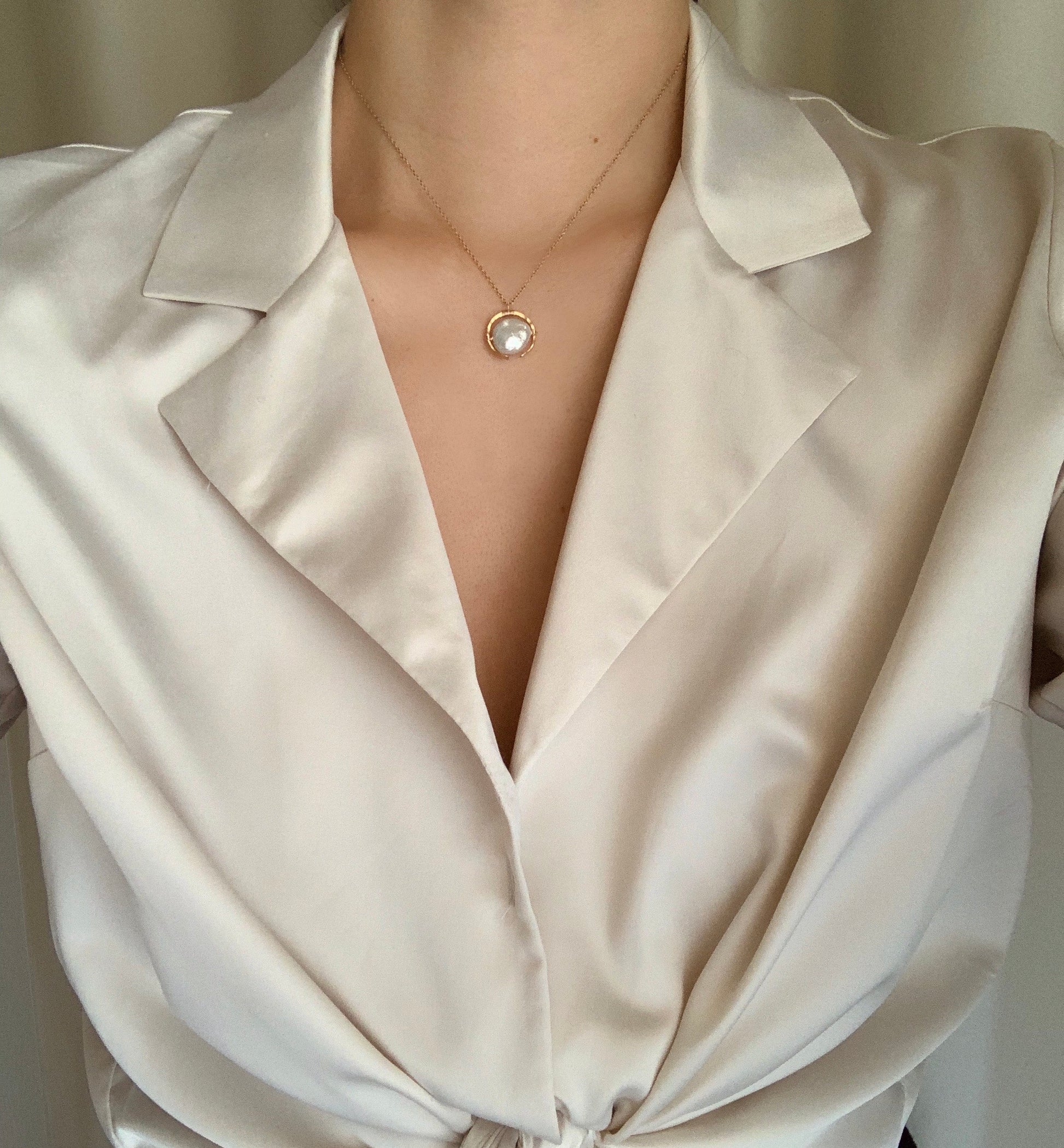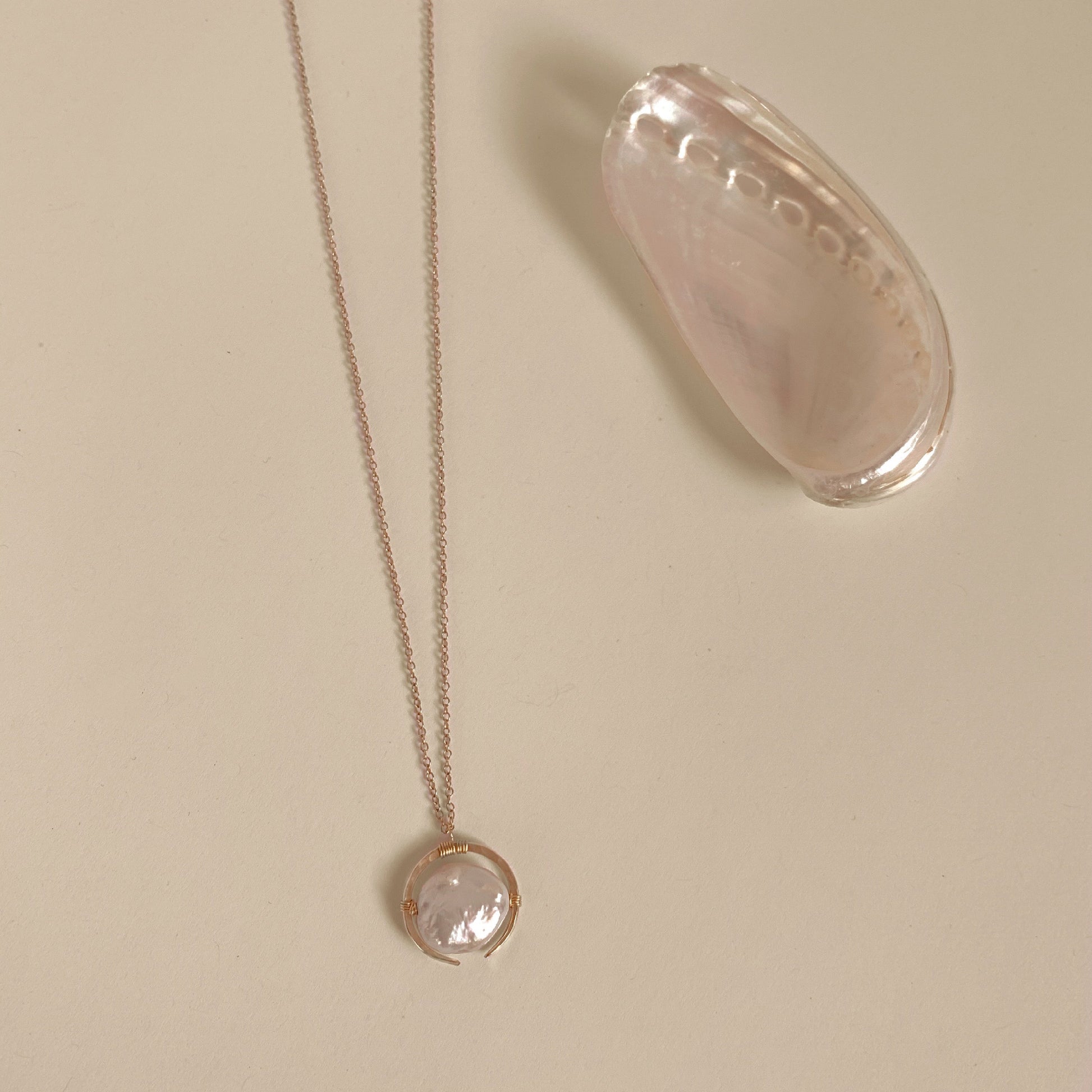 Fresh water pearl necklace framed with hand formed wire. Pendant is approximately .5” in diameter.