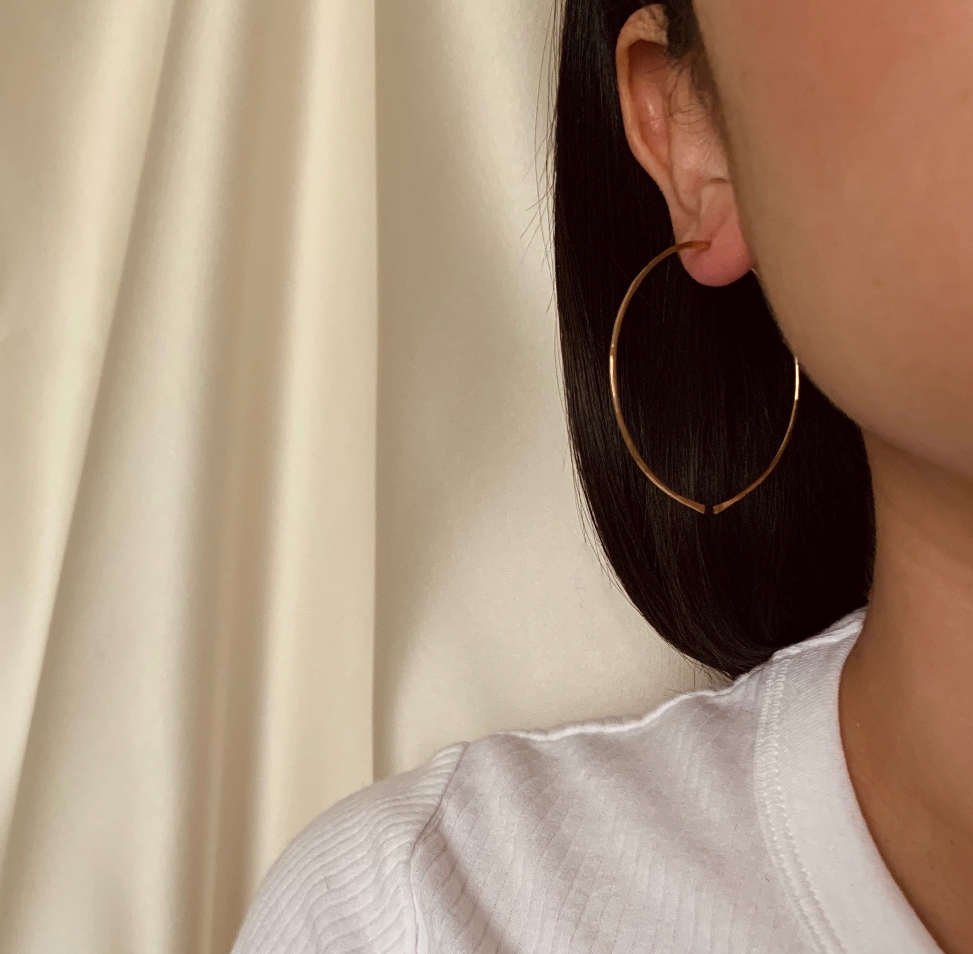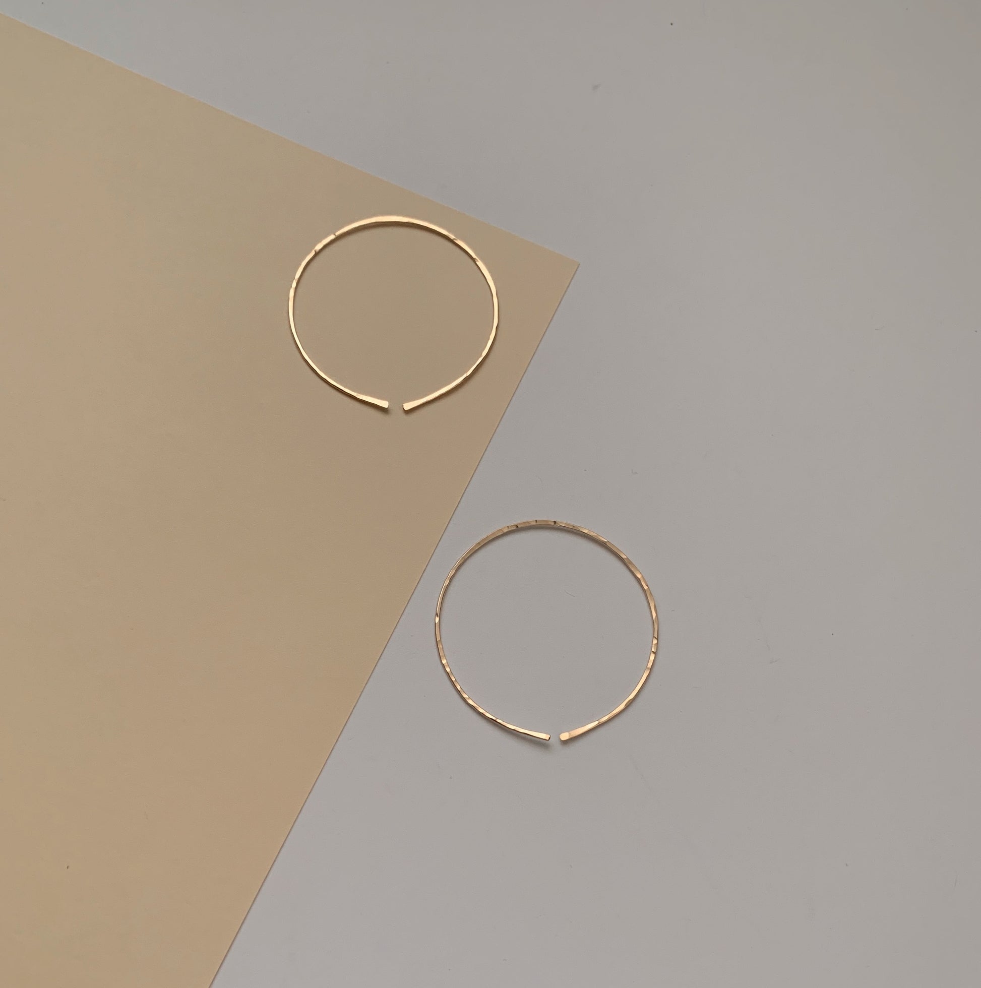 These delicate hammered hoops thread right through your ear. An effortless pair of earrings that can be worn with almost anything.