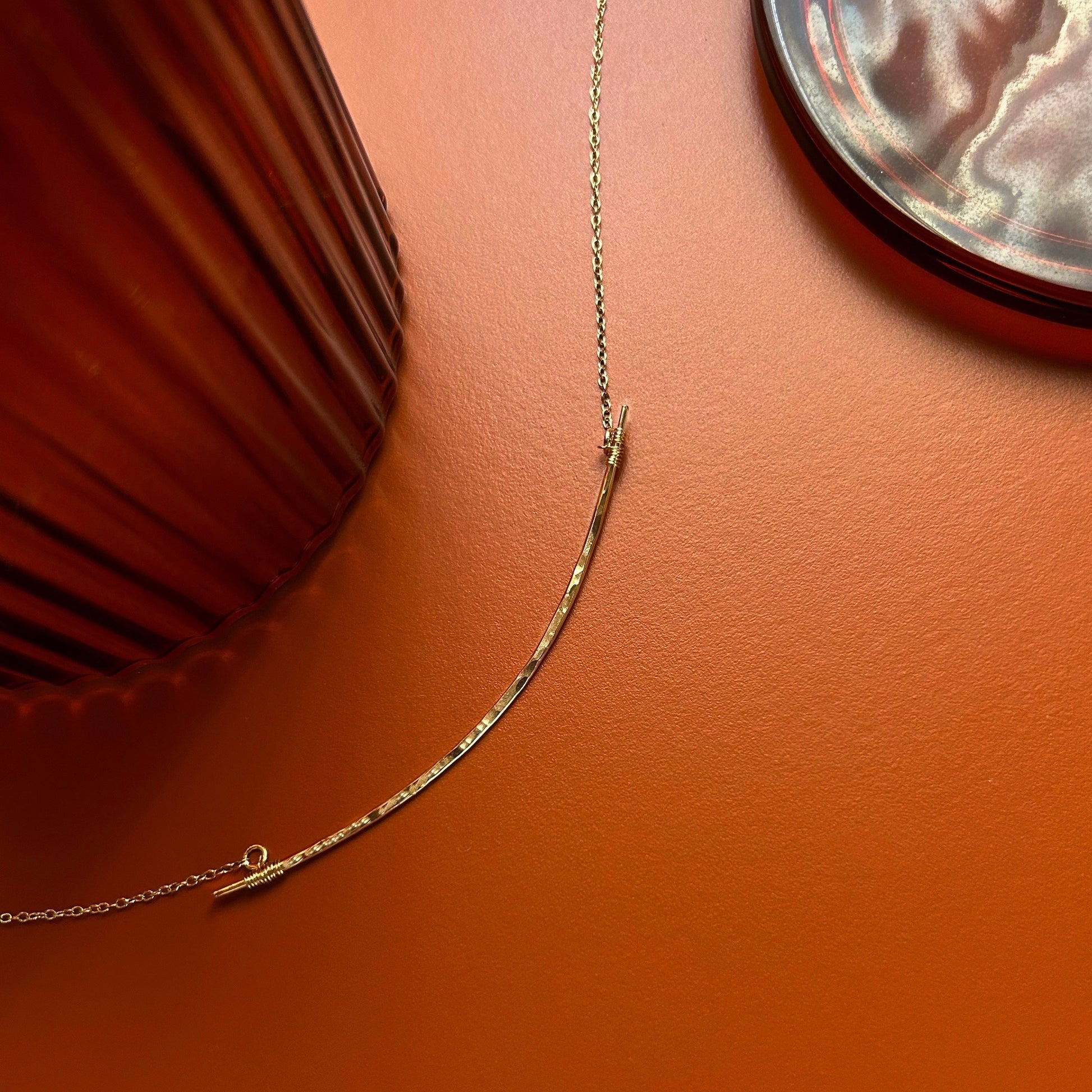 Hammered elongated bar necklace. Pendant is approximately 2.75” wide.