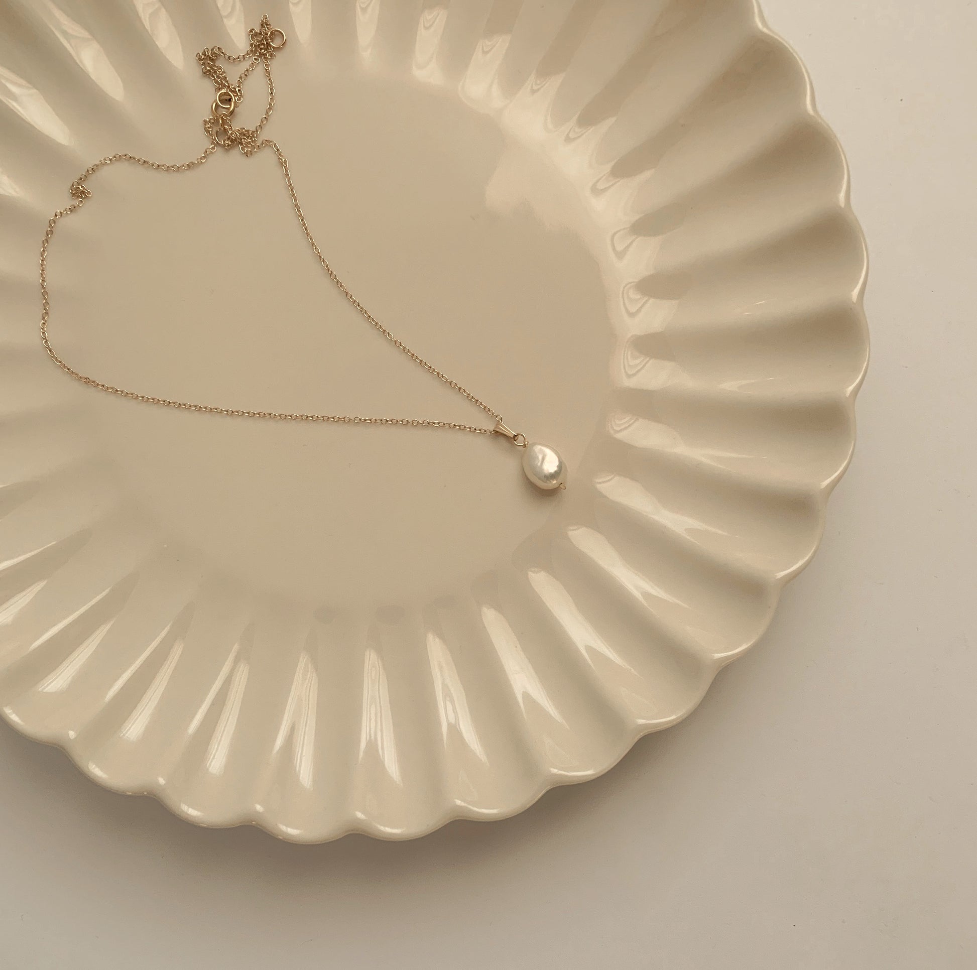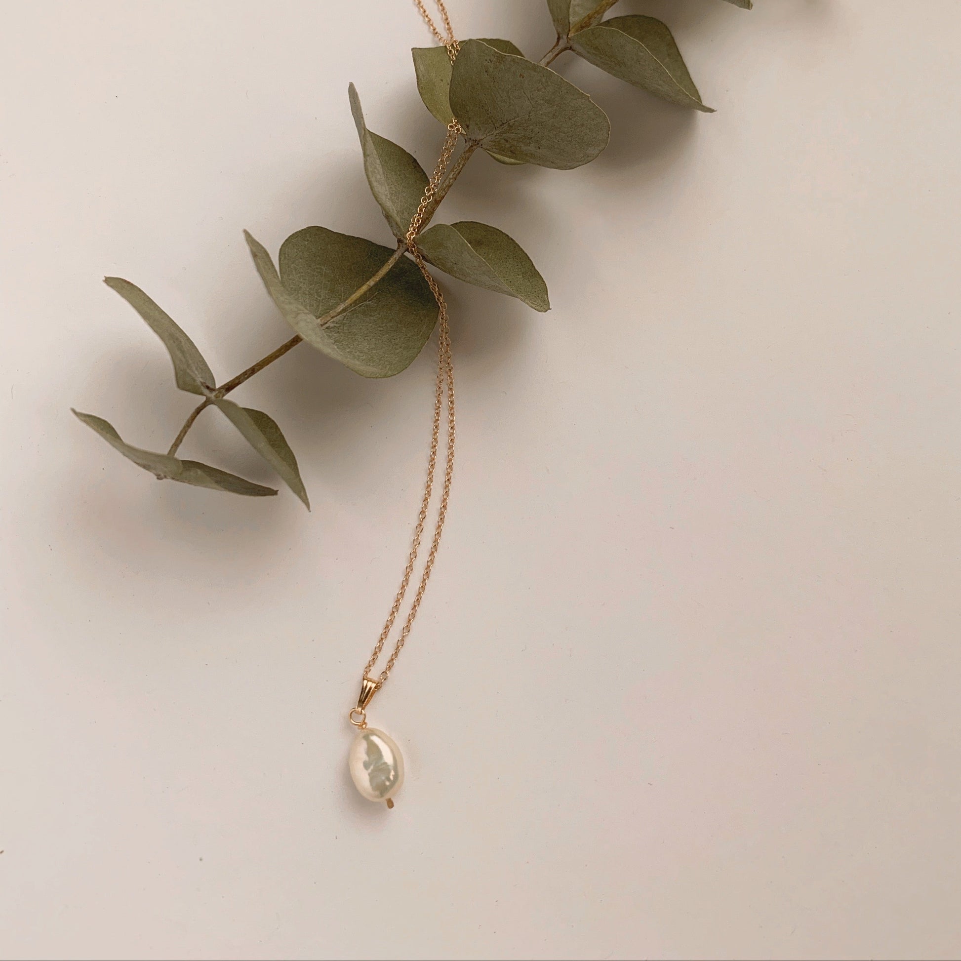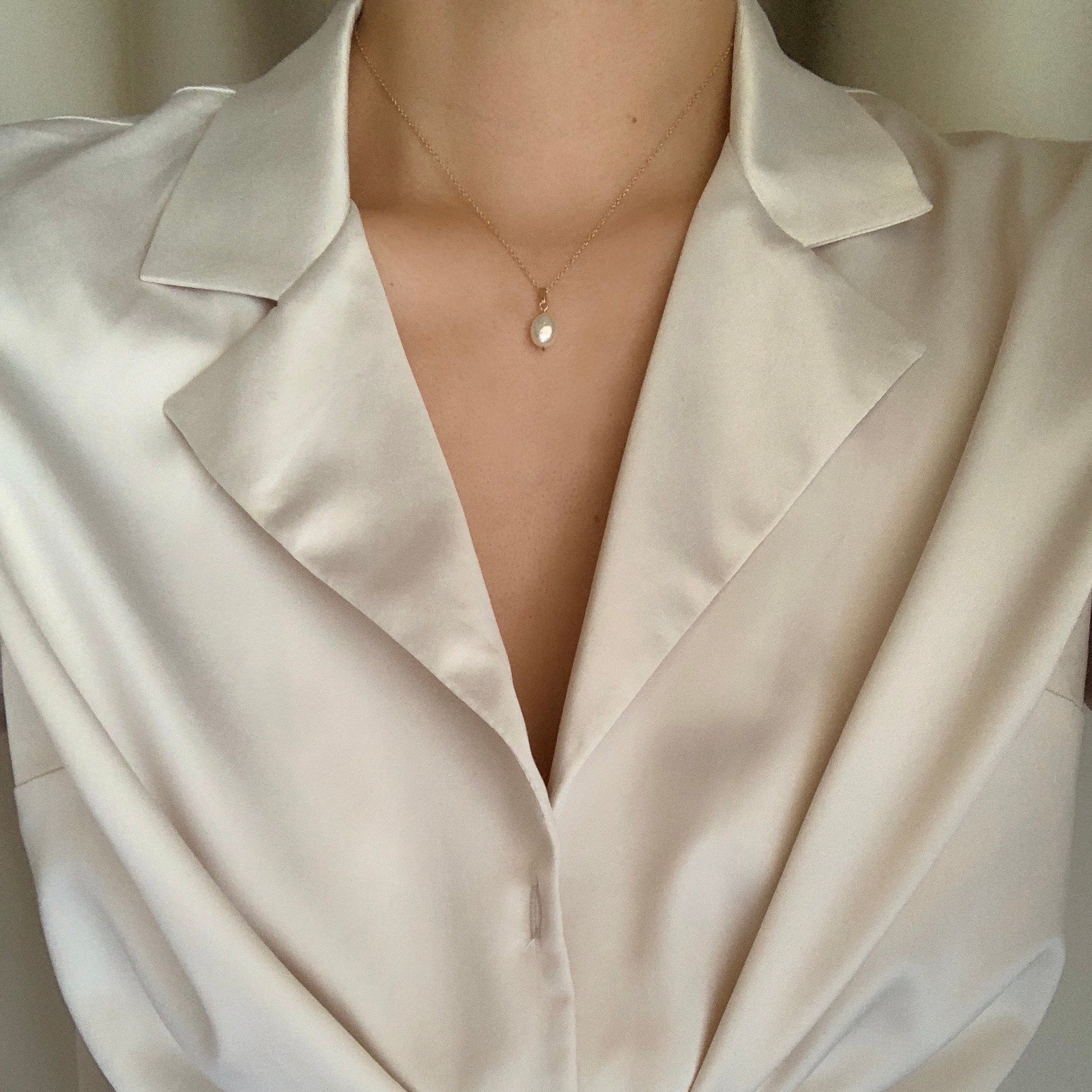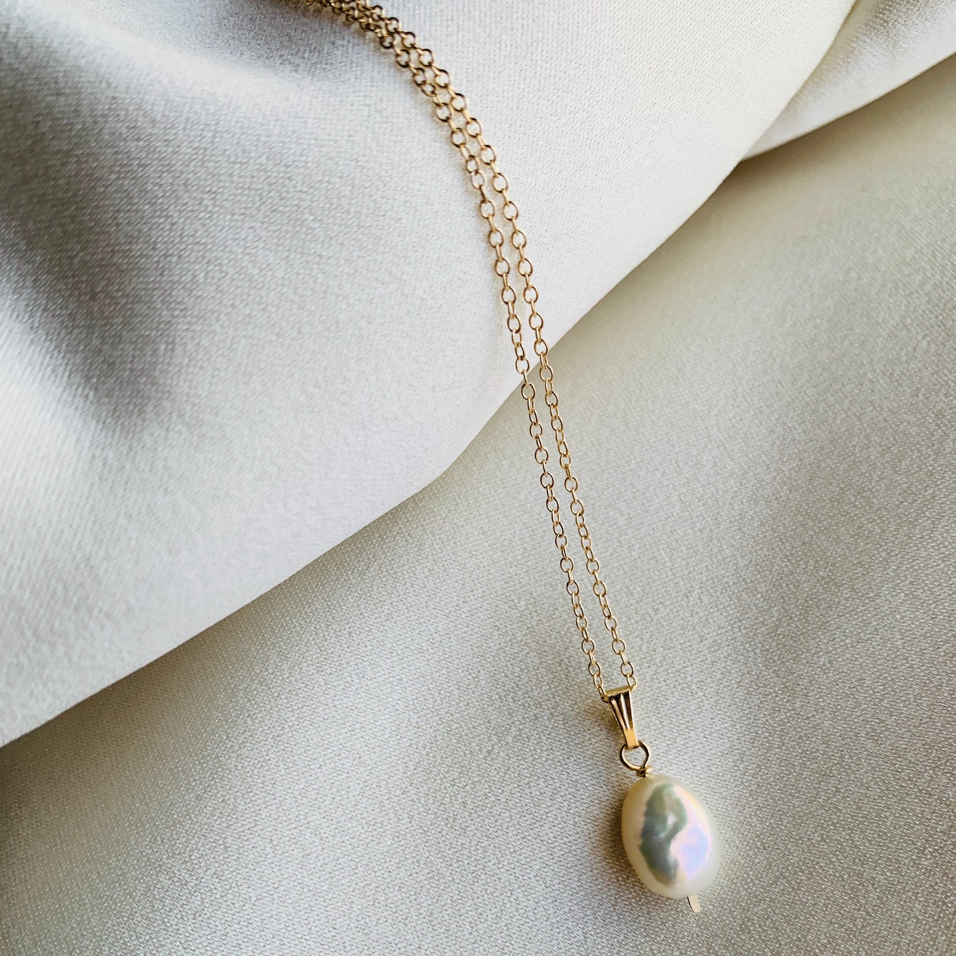 Fresh water pearl suspended from gold filled chain.