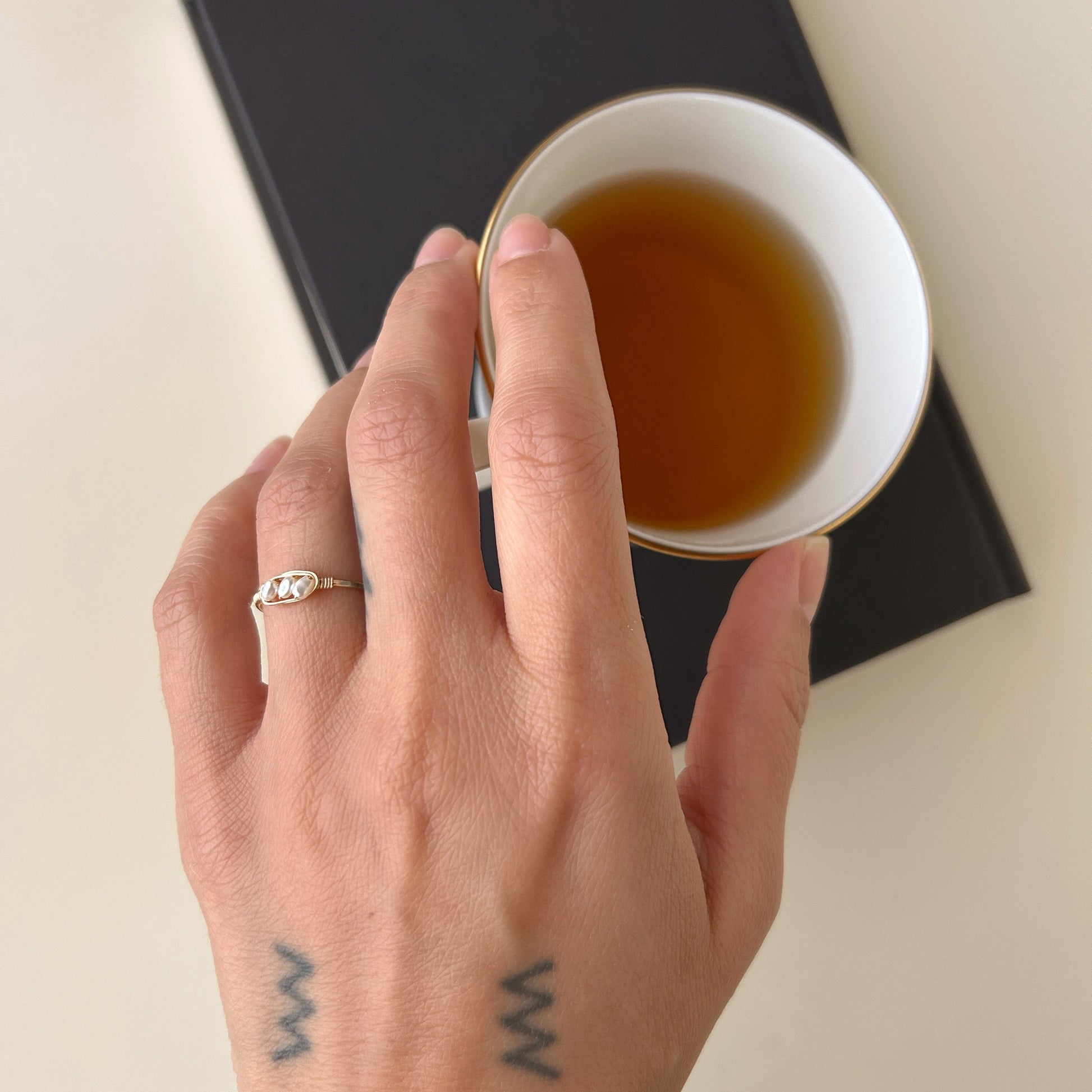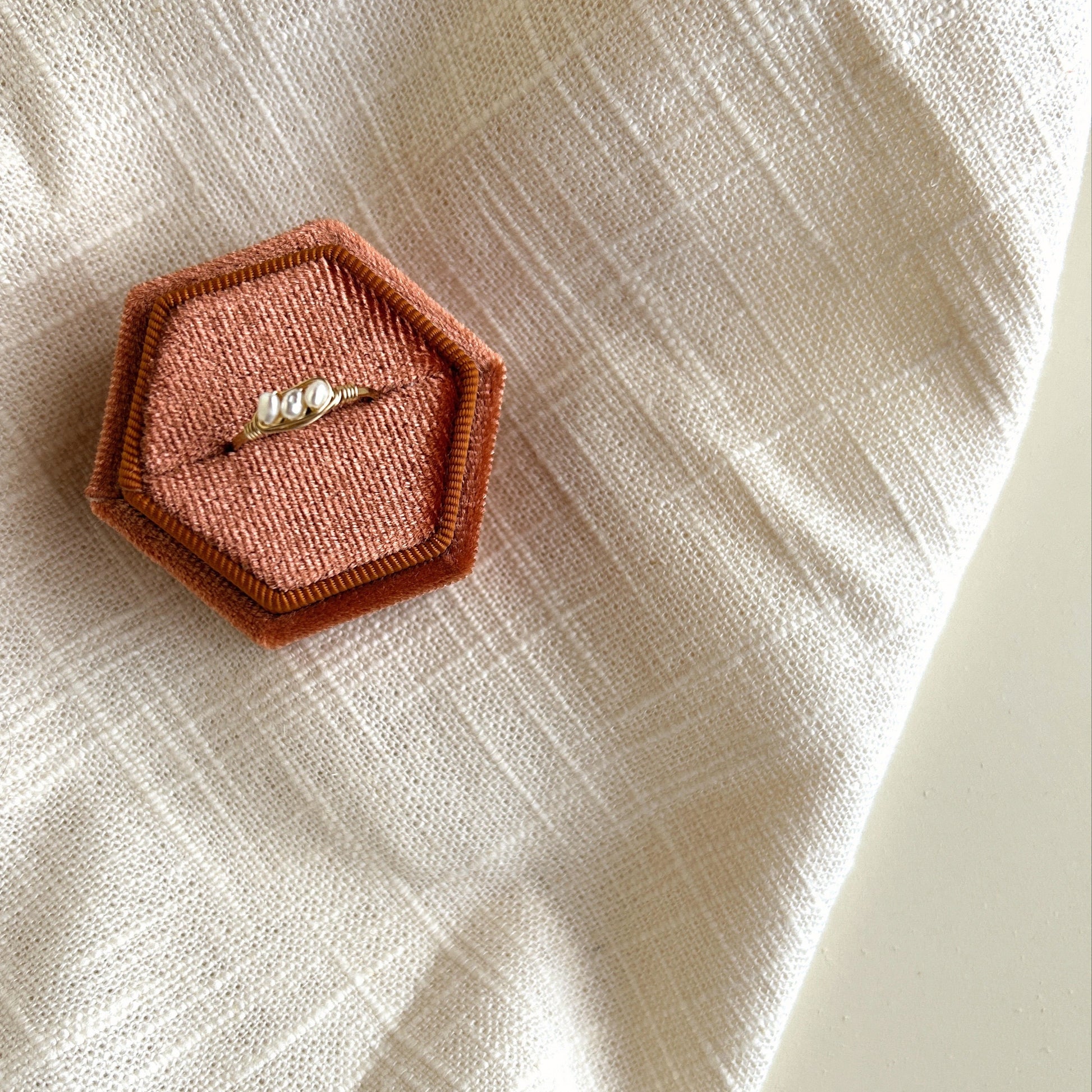 Three pearls nestled in wire wrapped ring.