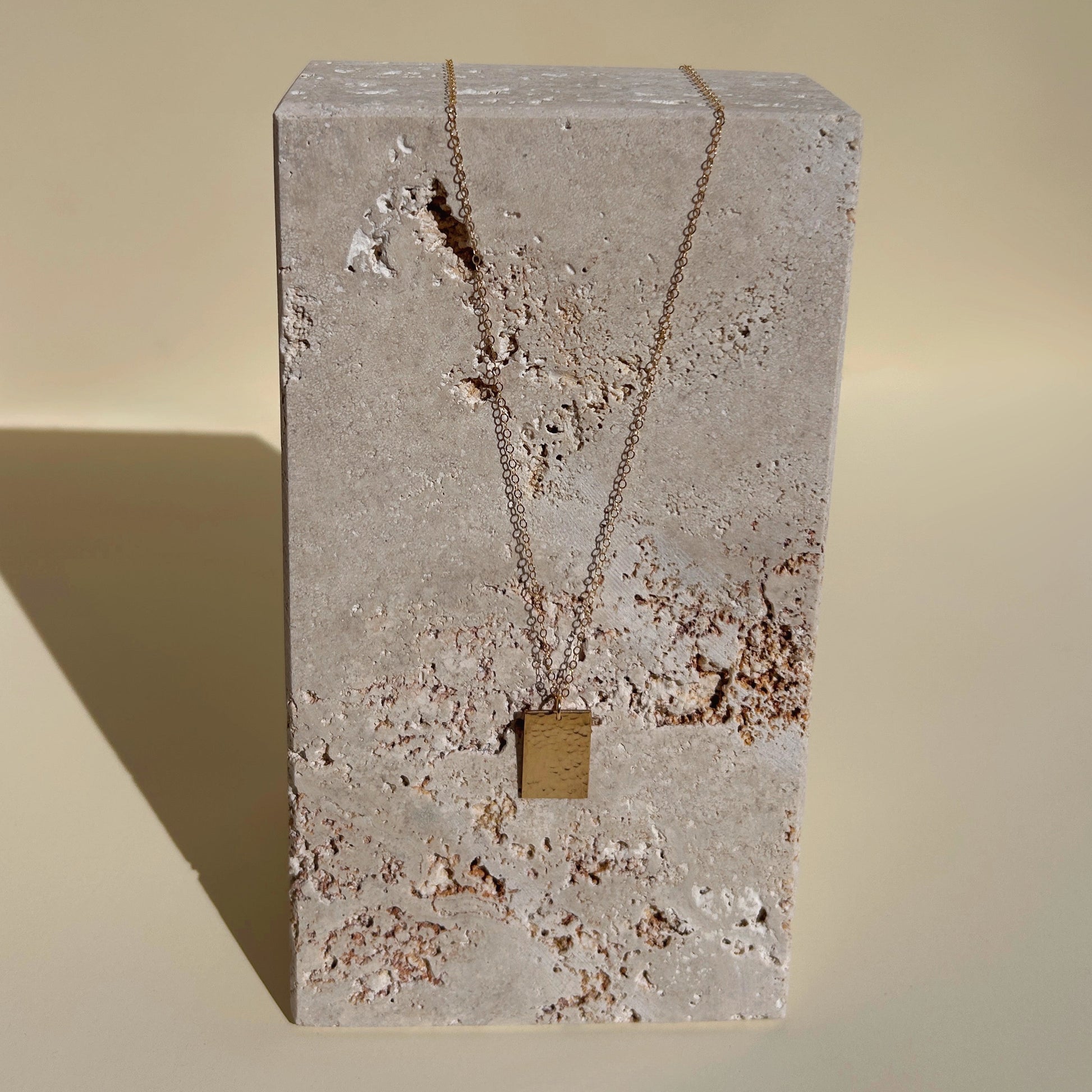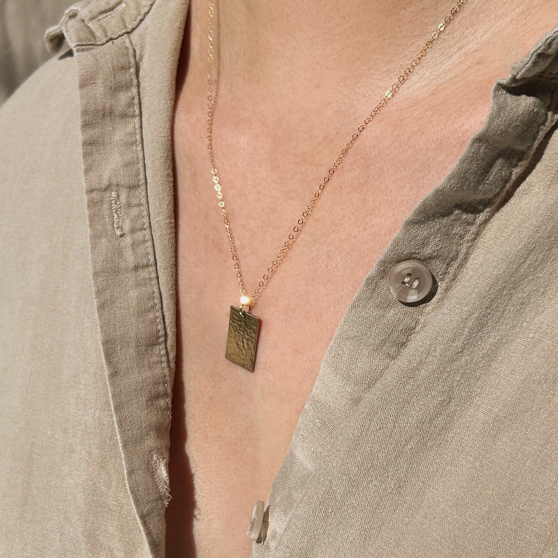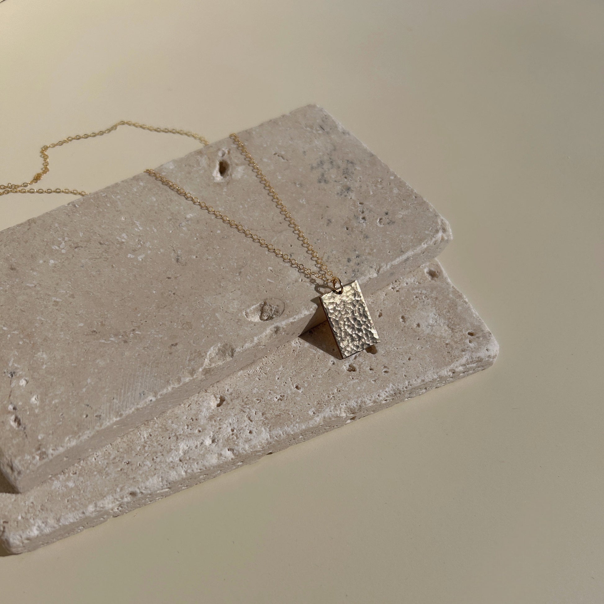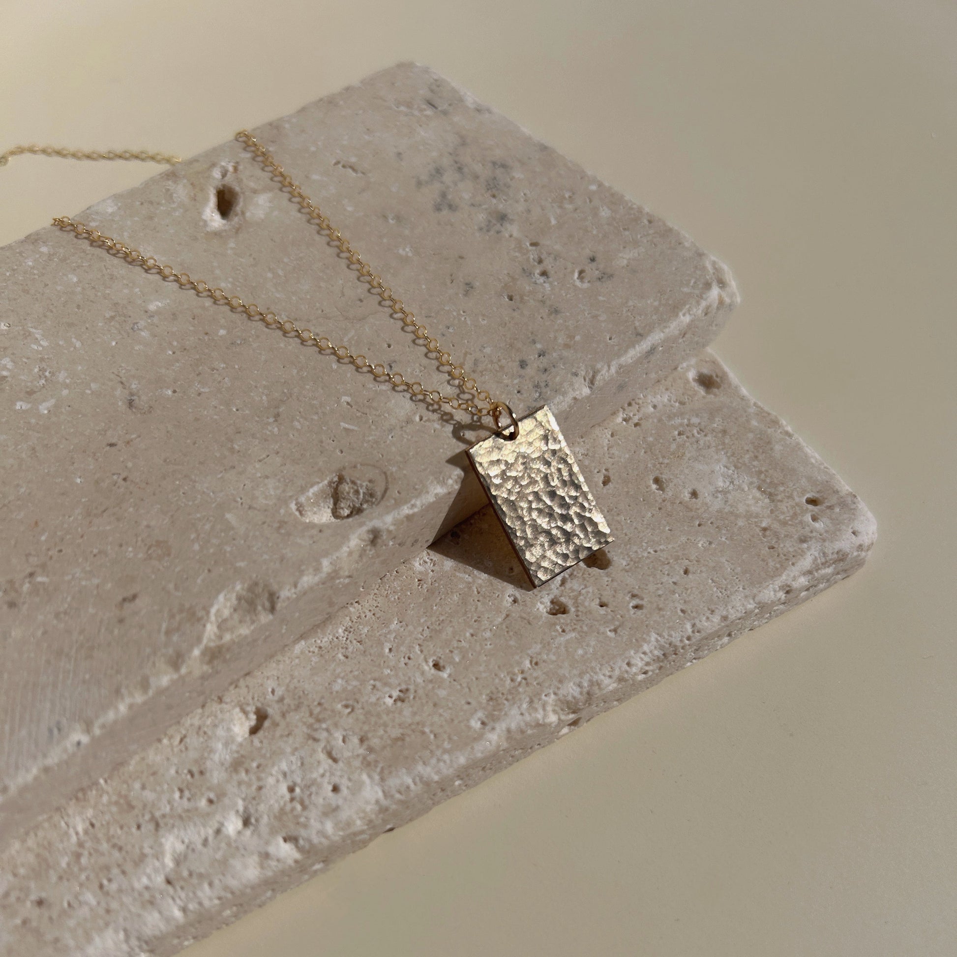 Hammered rectangle pendant is approximately 1/2” wide and 3/4” in length.